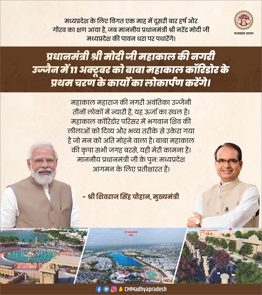 बड़े ही हर्ष और गौरव का विषय है कि माननीय प्रधानमंत्री श्री Narendra Modi जी एक माह में दूसरी बार पुनः मध्यप्रदेश की धरा पर पधारने जा रहे हैं। प्रधानमंत्री जी उज्जैन में 11 अक्टूबर को महाकाल मंदिर कॉरिडोर के प्रथम चरण के कार्यों का लोकार्पण करेंगे: CM