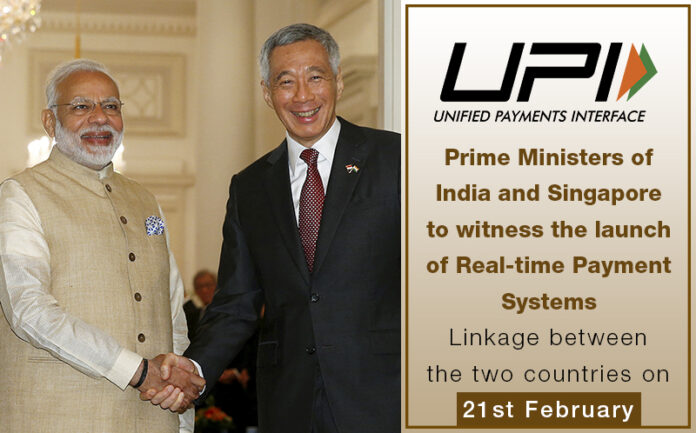 प्रधानमंत्री श्री नरेन्द्र मोदी और सिंगापुर के प्रधानमंत्री श्री ली सीन लूंग 21 फरवरी, 2023 को प्रात: 11 बजे (आईएसटी) भारत के यूनिफाइड पेमेंट्स इंटरफेस (यूपीआई) और सिंगापुर के ‘पे नॉउ’ के बीच क्रॉस-बॉर्डर कनेक्टिविटी लॉन्च होने के वीडियो कॉन्फ्रेंसिंग के माध्यम से गवाह बनेंगे। यह लॉन्च भारतीय रिज़र्व बैंक (आरबीआई) के गवर्नर श्री शक्तिकांत दास और मॉनेटरी अथॉरिटी ऑफ़ सिंगापुर (एमएएस) के प्रबंध निदेशक श्री रवि मेनन द्वारा किया जाएगा।