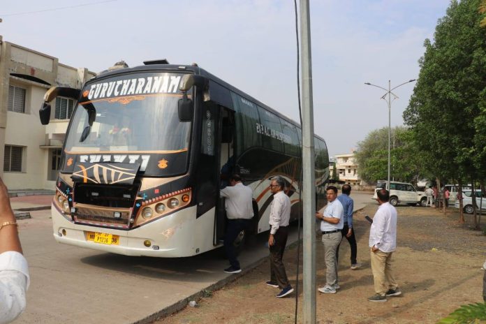 सिरोंज में आयोजित जनसुनवाई कार्यक्रम में शामिल होने विभिन्न विभागों के जिलाधिकारी कलेक्ट्रेट परिसर से बस से रवाना
