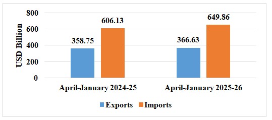 • अप्रैल-जनवरी 2025-26 के दौरान वस्तु आयात 649.86 बिलियन डॉलर था, जबकि अप्रैल-जनवरी 2024-25 के दौरान यह 606.13 बिलियन अमेरिकी डॉलर था।